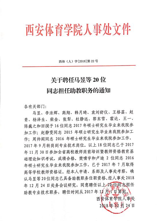 关于聘任马昱等20位同志担任助教职务的通知-久久不卡区,人事处