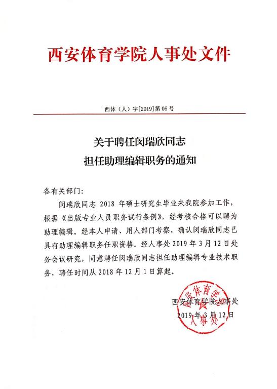 关于聘任闵瑞欣同志担任助理编辑职务的通知-久久不卡区,人事处