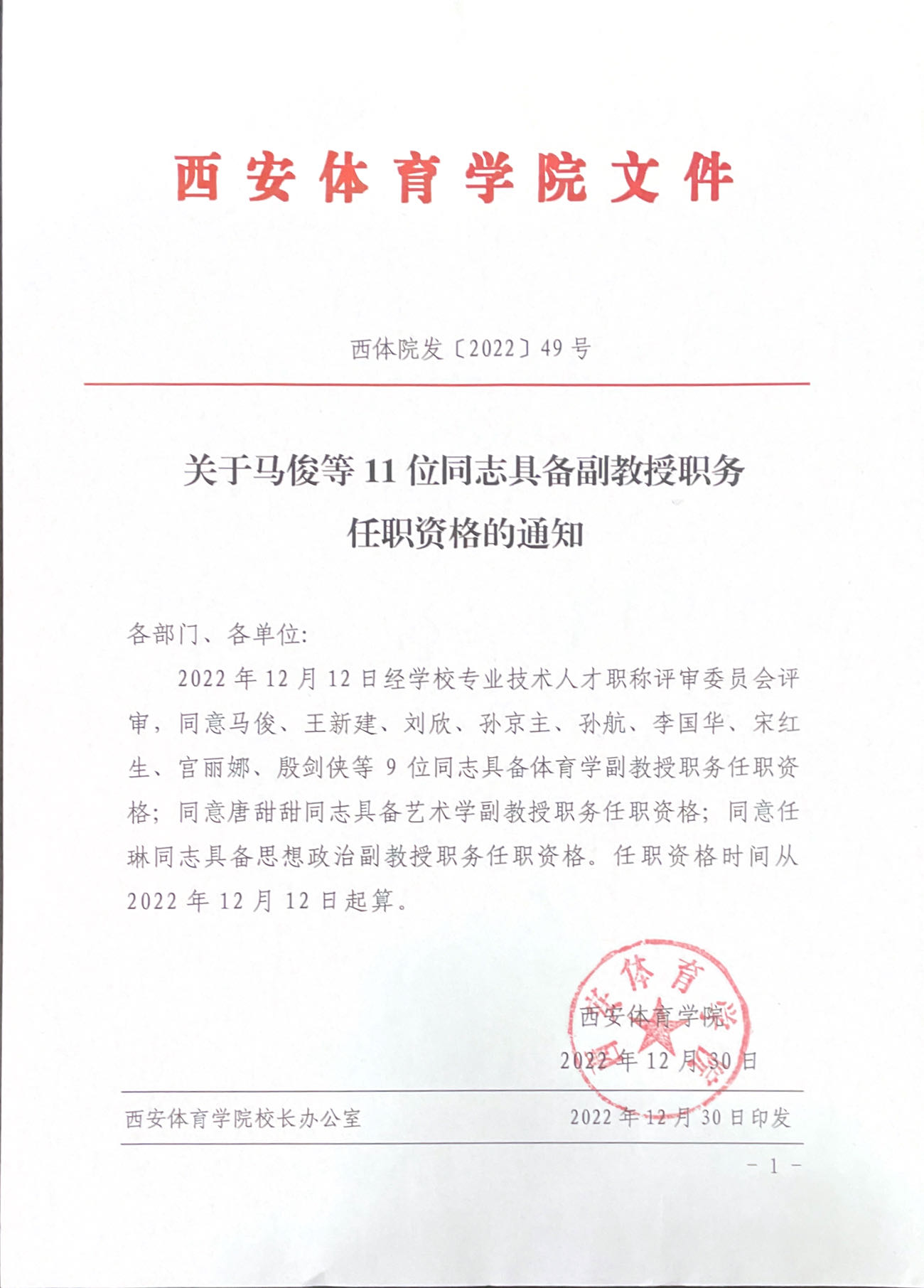 关于马俊等11位同志具备副教授职务任职资格的通知