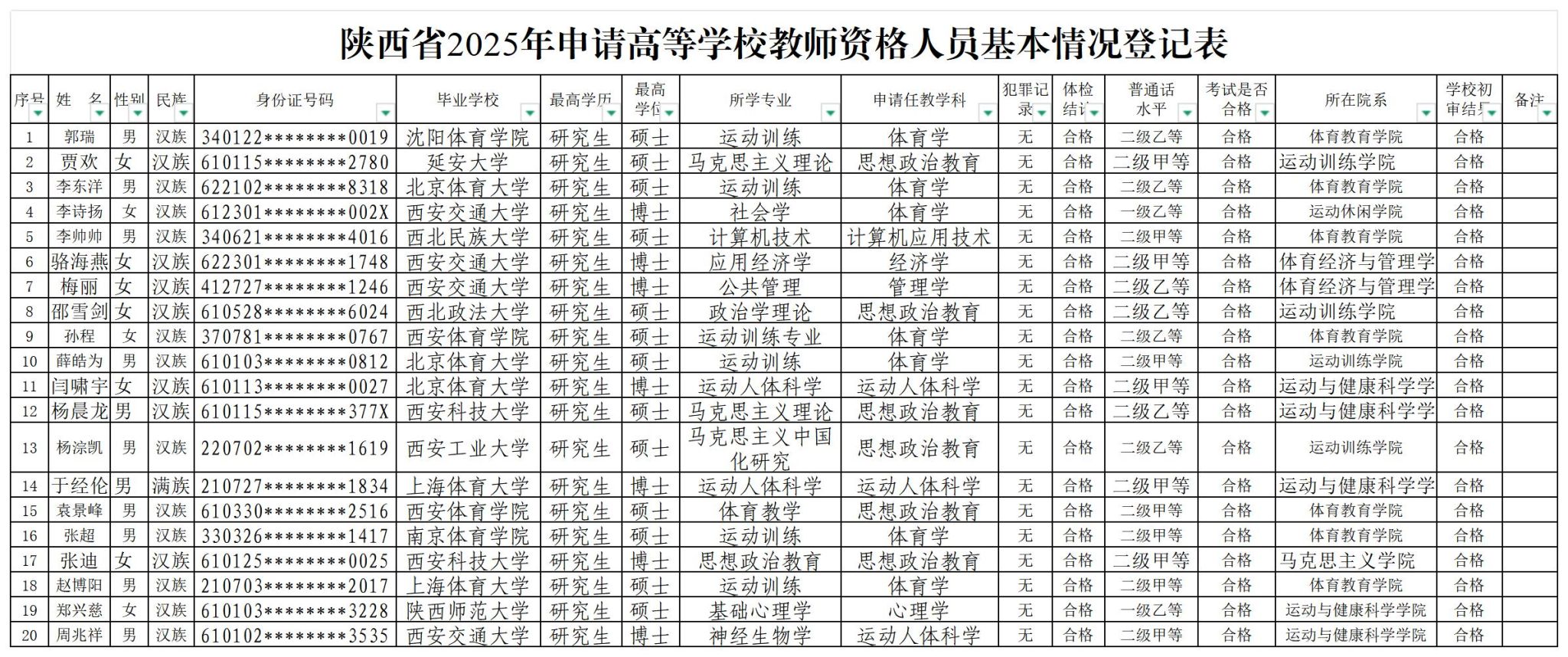 根据《陕西省教育厅办公室 关于做好2025年全省高等学校教师资格专业技能考试与认定工作的通知》(陕教师办〔2025〕4 号)要求,现将我校参加2024年教师资格教育基础理论知识考试合格,符合陕西省2025年申请高等学校教师资格人员基本情况予以公示,公示期5个工作日(2025年6月23日-2025年6月27日,如有异议,请于2025年6月27日前向人事处或校纪检监察部门客观如实地反映公示对象的情况。