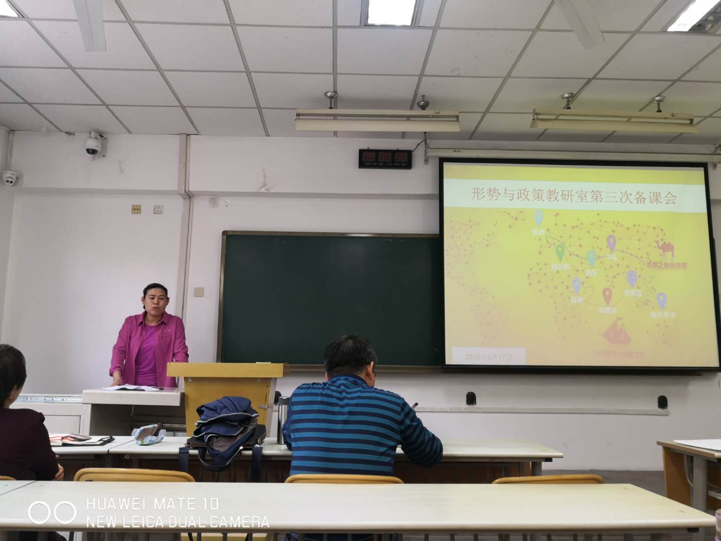 王一、耿莉、谢千、王青、于昕等十八位老师分别从形势与政策课程的教学内容、教学形式、教学组织方式和教学方法等方面发表了自己的观点,重点内容包涵“一带一路”建设的重大意义、丰富内涵、路线方法、“一带一路”提供的世界机遇以及国际合作等,并结合学情特点,讲述了对于学生未来发展的机遇与挑战。各位老师们的发言使得大家取长补短,互相学习。