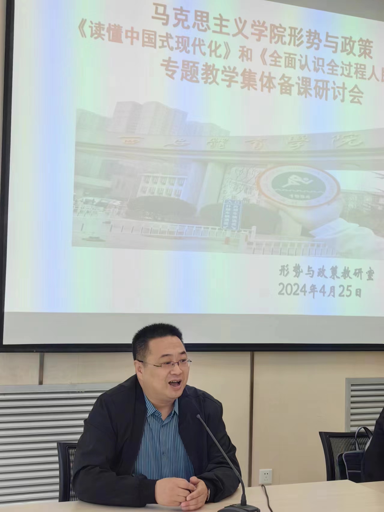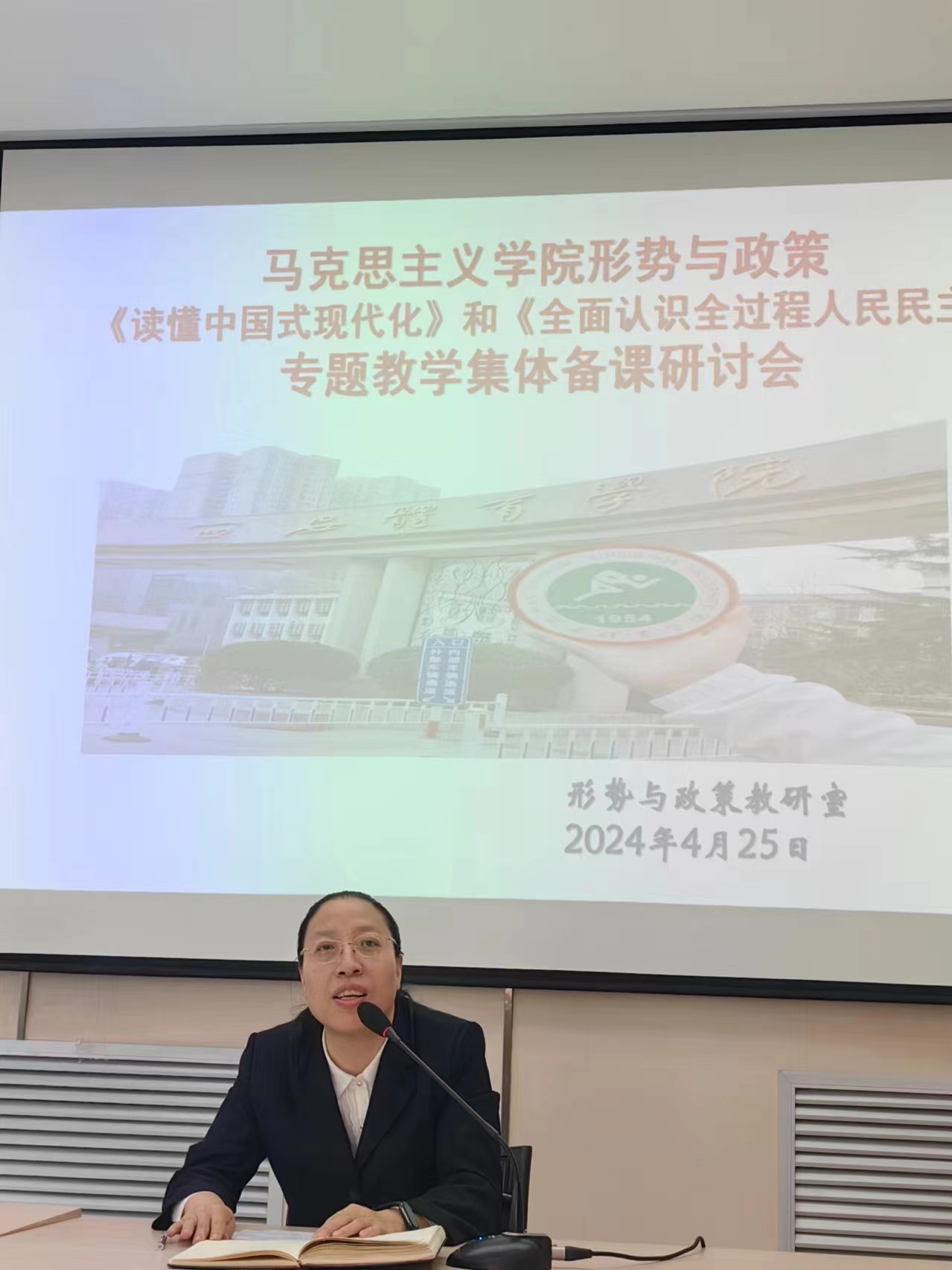 形势与政策教研室副主任马红娟就本学期形势与政策课教学安排以及教育部、省教工委教学要求做了传达。本学期教学安排四个专题为《读懂中国式现代化》《全面认识全过程人民民主》《当前国际形势与中国原则立场》《当前就业形势与实施就业优先战略》。在授课中,要将新时代伟大变革转化为形势与政策课教学案例,切实提升形势与政策课的针对性和吸引力并且凝练总结形势与政策课建设经验成果,教育部、省委教工委及学校将跟踪了解我院形势与政策课教学情况。