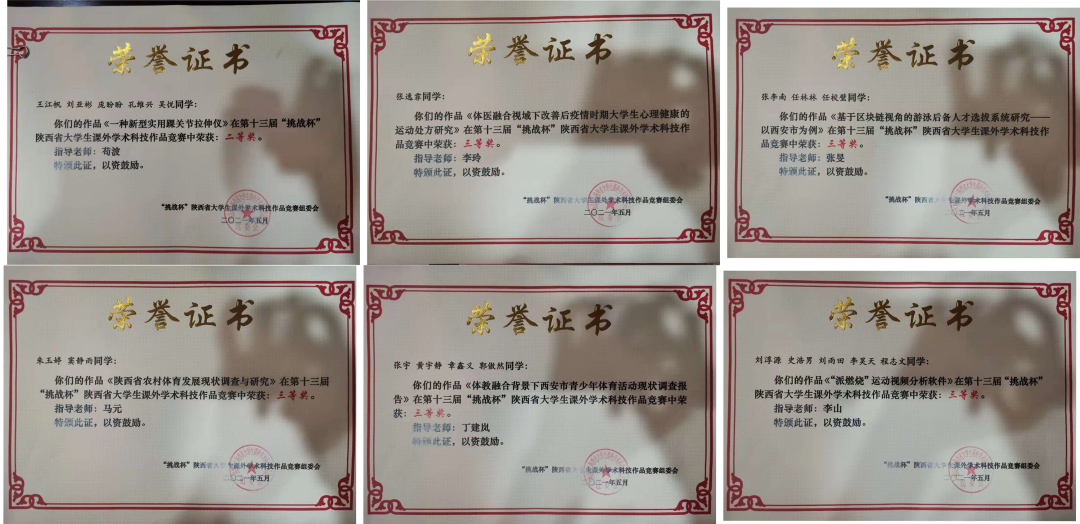 在十三届“挑战杯”陕西大学生课外学生科技作品竞赛中,由苟波老师指导的、王江帆 刘亚彬 庞盼盼 孔维兴 吴悦 同学的作品《一种新型实用踝关节拉伸仪》荣获大赛二等奖;李玲老师指导的张逸霏同学的作品《提议融合视域下改善后疫情时期大学生心理健康的运动处方研究》荣获大赛三等奖;张旻老师指导的张李楠 任林林 任校璧同学的作品《基于区块链视角的游泳后备人才选拔系统研究——以西安市为例》荣获大赛三等奖;马元老师指导的朱玉婷 窦静雨同学的作品《陕西省农村体育发展现状调查与研究》荣获大赛三等奖;丁建岚老师指导的张宇 黄宇静 章鑫义 郭傲然同学的《体教融合背景下西安市青少年体育活动现状调查报告》荣获大赛三等奖;李山老师指导的刘淳源 史浩男 刘雨田 李昊天 程志文同学的《“燃烧派”运动视频分析软件》荣获大赛三等奖。