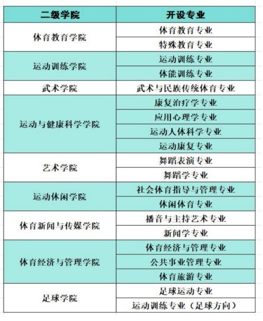 学校现有招生本科专业19个,其中体育类专业10个,涵盖了文、理、经、管、教、医、艺7个学科门类,是西北地区体育学类专业数量最多的体育综合高等院校。
