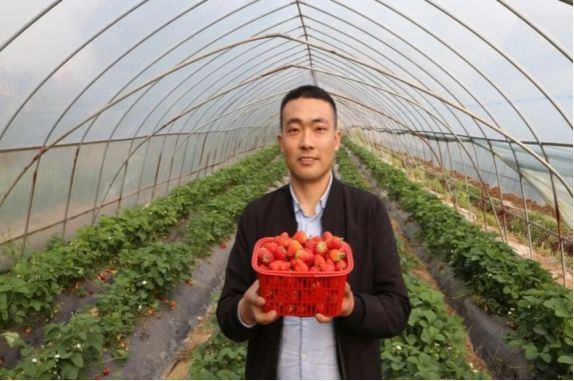 杨伟展示新时代家庭农场新收获的草莓。(受访者供图)