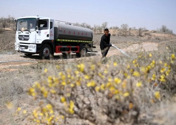 5月,甘肃省武威市古浪县八步沙林场的柠条花开了。淡黄的小花如繁星散落沙海,透出点点生机。山坡上,管护员郭玺正在往大大小小的树坑里浇水。“这是我在2019年种下的,长得很好。有了它们,风就吹不动沙子了。”路过一株半米高的柠条时,他对记者说。