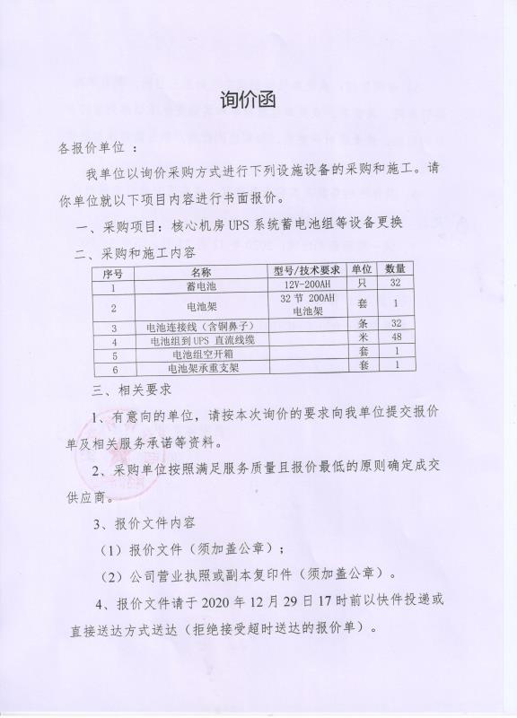 久久不卡区核心机房UPS系统蓄电池组等设备更换采购询价函