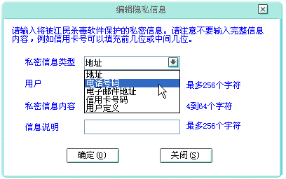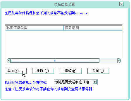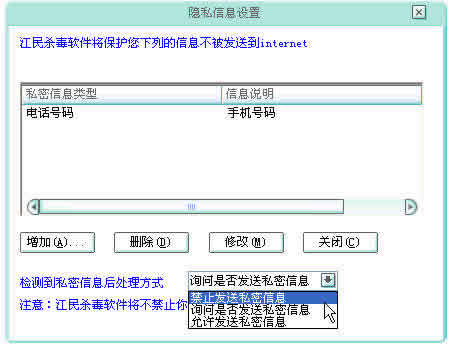 最后选择并确认“检测到私密信息后的处理方式”;按“关闭”后私密信息就增加到程序当中,用户也可以对设置的私密信息进行删除和修改;
