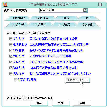 注:在启用“隐私保护”监视时“邮件监视”和“网页监视”就会自动启动,如果关闭“邮件监视”和“网页监视”那么“隐私保护监视”就会自动取消;但关闭“隐私保护”监控时不会影响“邮件监视”和“网页监视”的状态。