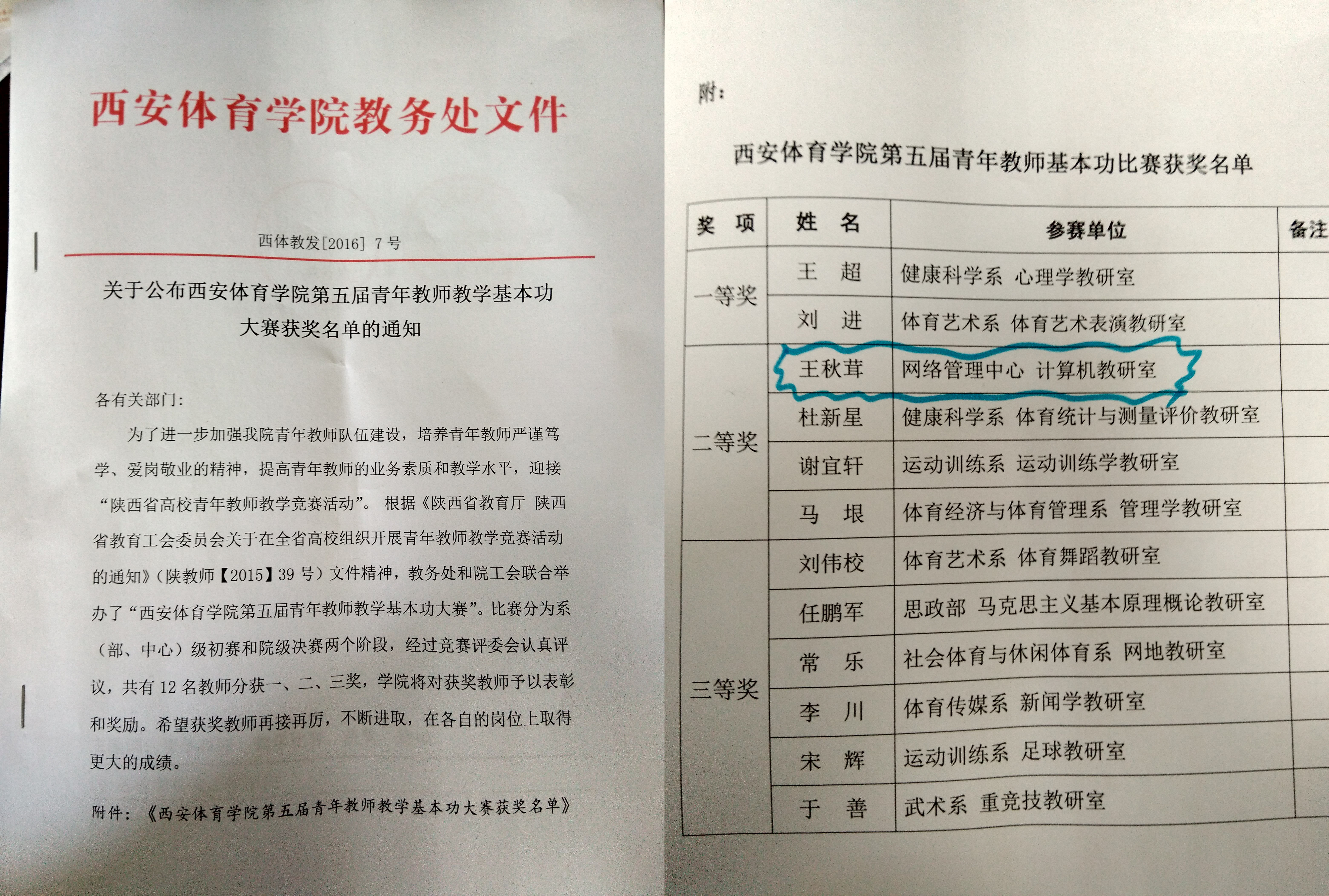 其中,网络管理中心计算机教研室主任王秋茸副教授以出色的表现获得了二等奖,为计算机教研室全体老师做了非常好的表率和示范,希望全体教师以此为榜样,认认真真,踏踏实实上好每一节计算机课。