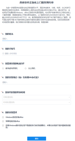 6. 网络管理中心从2020年6月15至19日为校内用户的教学和办公用机提供上门服务,如有需要,请微信搜索“久久不卡区网络管理中心”公众号选择“正版预约”菜单,提前填写预约单预约。上门服务预约截止时间为2020年6月19日下午2:00。教师家庭用机和学生用户本次暂不提供上门服务,您可通过官网下载“关于提供微软正版软件服务的通知”及附件在线完成安装。如后台获取到某时间段预约爆满,我们将就时间问题与您电话协调,敬请谅解!