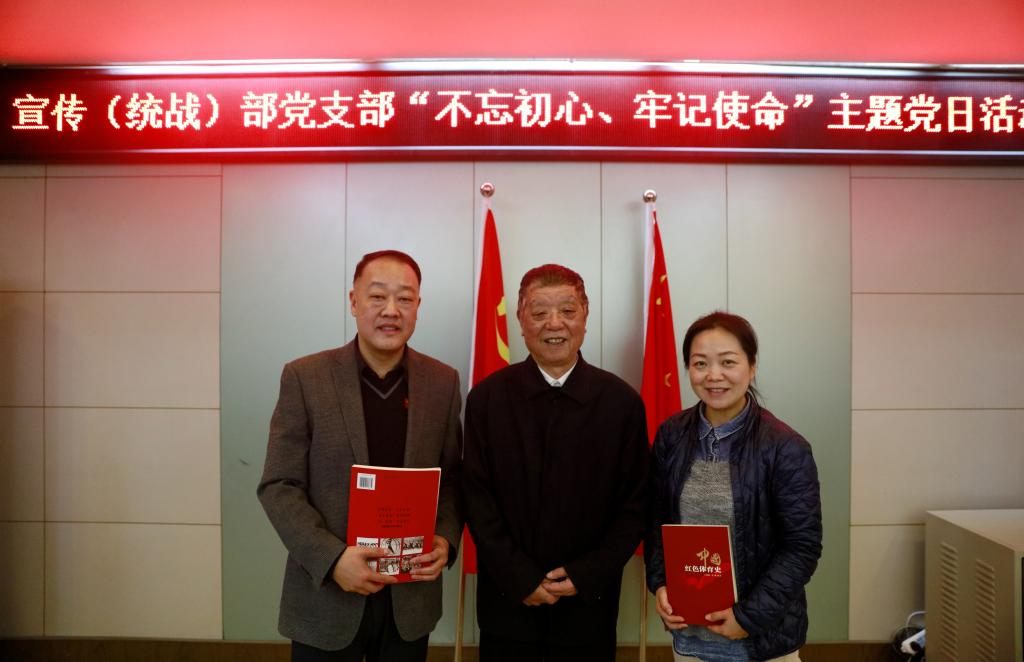 活动最后由王增明教授向党委宣传部赠书,张朝阳代表宣传部感谢王老的珍贵礼物并合影留念。