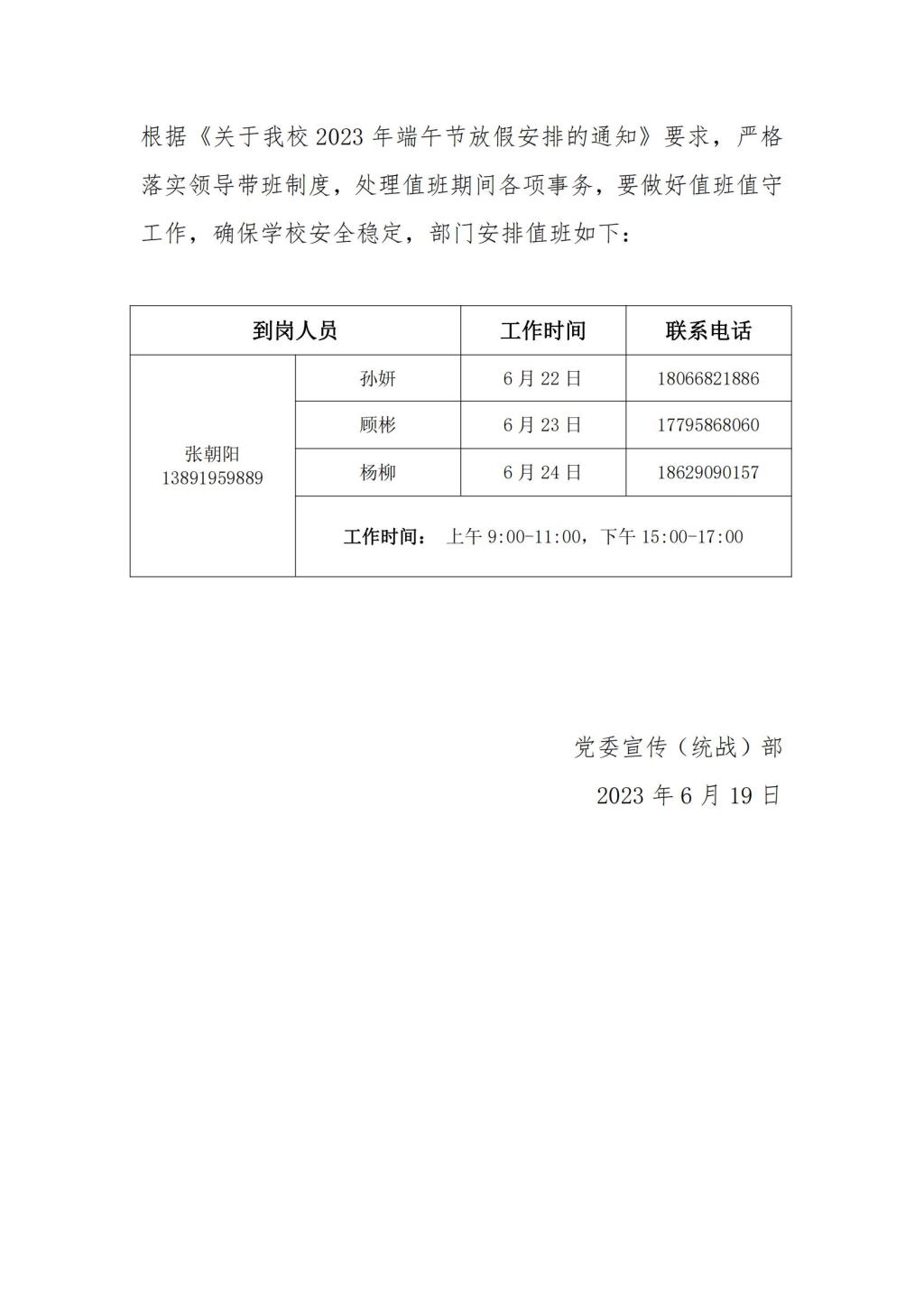 党委宣传(统战)部2023年端午节值班安排-宣传部