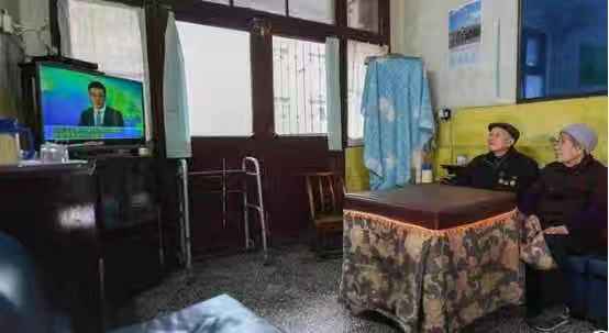 张富清和老伴在两居室家中收看新闻(新华社程敏 摄)