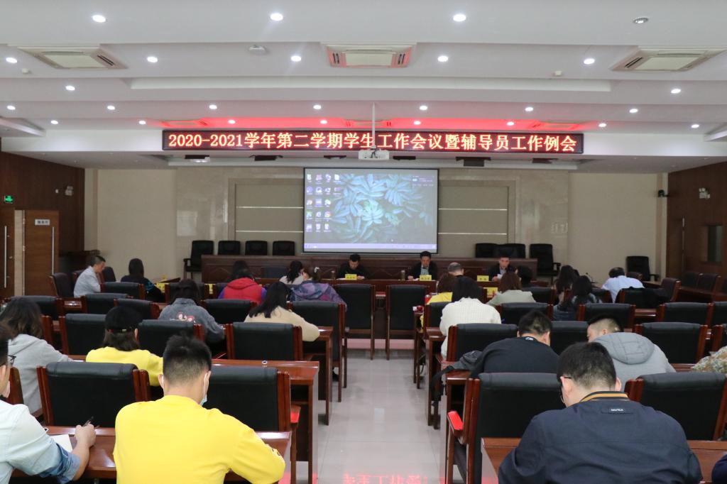 3月29日下午15:00,我校在二号行政楼6楼报告厅召开2020-2021学年第二学期学生工作会议暨辅导员工作例会在,副校长张卫国出席会议,各二级学院党委书记、党总支书记,全体辅导员及学工部工作人员参加了此次会议,会议由学工部副部长樊敏主持。