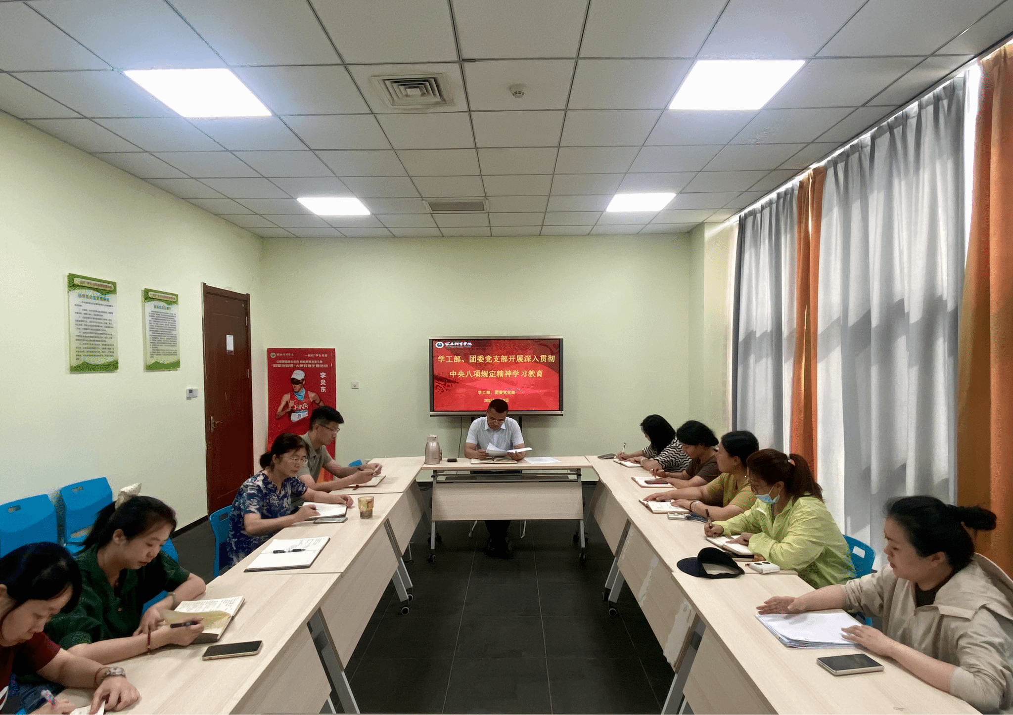 为扎实开展深入贯彻中央八项规定精神学习教育,引导党员干部锲而不舍落实中央八项规定精神,自觉增强开展学习教育的责任感、紧迫感。6月9日下午,学工部、团委党支部在棒球副馆学工部会议室开展深入贯彻中央八项规定精神学习教育集中学习。会议由党支部书记马国华同志主持,支部全体党员参加学习。