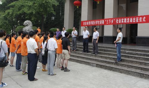为引导学生深入学习贯彻科学发展观,全面实践胡锦涛总书记在清华大学百年校庆上对广大青年提出的三点希望,大力推进农村精神文明建设,7月11日,我院大学生暑期“三下乡”社会实践活动正式启动。 本次社会实践活动得到了学院的大力支持,院党委副书记朱元利、党委组织部部长刘新平、宣传部部长何佰虎、学工部部长张朝阳、学工部副部长缑荣涛出席本次社会实践活动出征仪式并为各支服务队授旗。朱元利副书记发表热情洋溢的讲话,号召同学们能够在实践中充分展示出西体学子良好的专业素质和精神风貌,达到学习知识、增长才干、贡献力量的预期目标。 本次“三下乡”实践队伍由“全民健身”服务队、“农民体育健身工程”调研团、“民族民间体育促进社会主义新农村文化建设”服务队、“追寻红色足迹”服务队组成,各服务队以指导带领当地群众开展全民健身活动、考察当地农村和乡镇群众全民健身的开展情况、调查当地体育教师教学训练情况为活动主要内容,同时学院也希望服务队走进延安,了解延安,感受延安精神,接受革命传统教育。